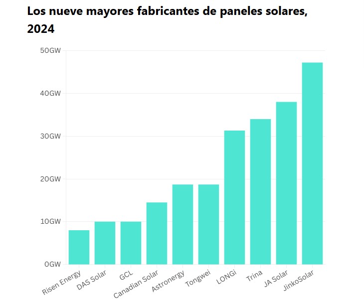 De acuerdo al último Informe de actualización de la industria solar publicado por el Laboratorio Nacional de Energía Renovable de los Estados Unidos en diciembre de 2024, se determinó quiénes son los nueve fabricantes de paneles solares más grandes del mundo. El informe, aquí: https://www.nrel.gov/docs/fy25osti/92257.pdf
