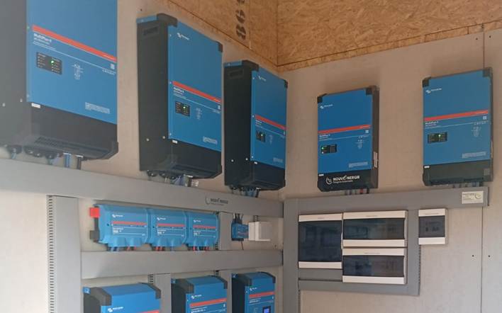 En cuanto a la conversión y gestión de la energía, el sistema combina dos inversores Victron Multiplus de 5 kW utilizados tanto para la toma de energía monofásica de red y para la carga del banco de baterías. Estos se combinan con tres inversores Victron Multiplus de 8 kW configurados en red trifásica, responsables de abastecer los consumos de las viviendas. Esta arquitectura permite cubrir picos de demanda, estabilizar la red interna del conjunto de viviendas y optimizar el aprovechamiento de la energía solar generada.