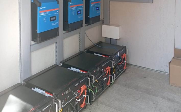 En esta primera etapa, la microred alcanza una potencia instalada de 18,4 kWp, compuesta por 32 módulos Jinko Solar de 575 W. La regulación solar se realiza mediante dos controladores Victron SmartSolar MPPT de 450 V y 60 A, preparados para trabajar con strings de alta tensión y admitir futuras ampliaciones. El almacenamiento energético se resuelve a través de un banco de ocho baterías de litio Pylontech UF5000, que aportan una capacidad total de 40 kWh.
